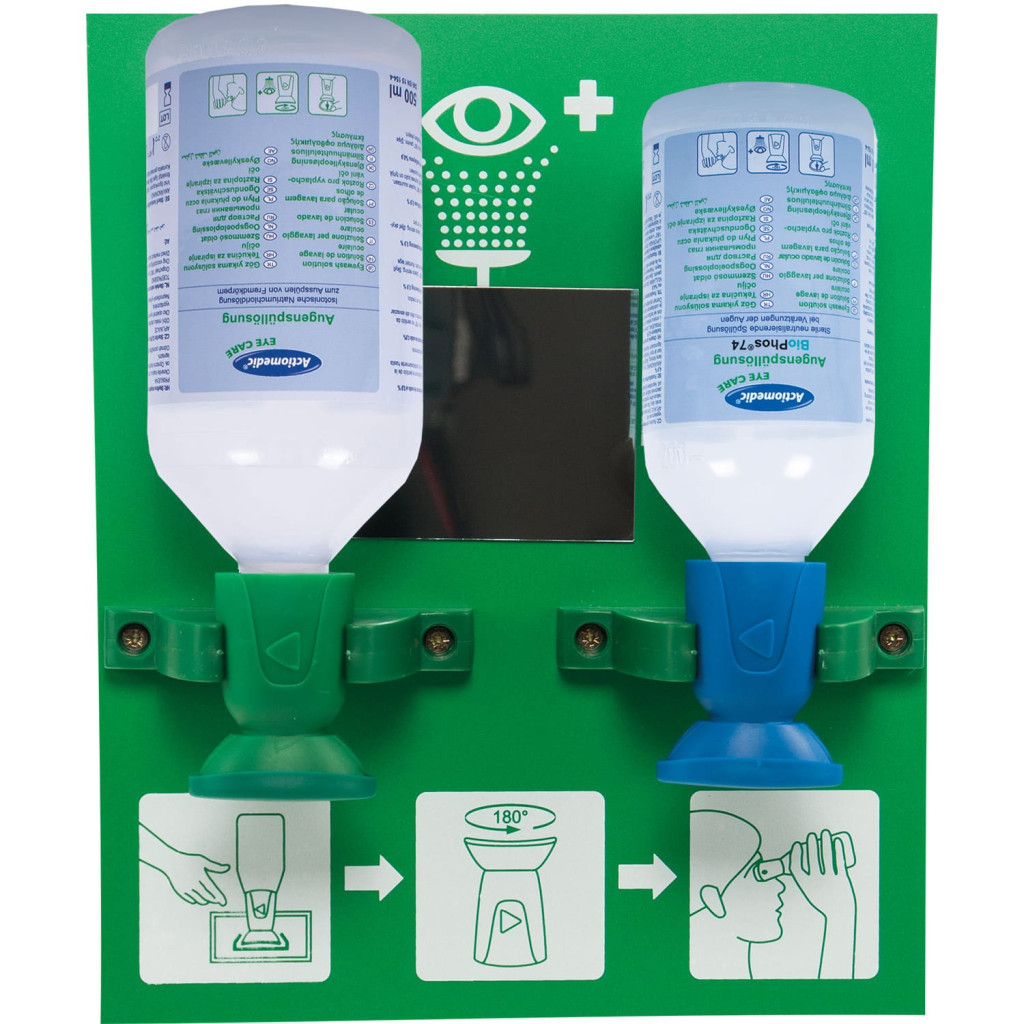 Actiomedic EYE CARE Double II fali szemkimosó állomás 1 x 500 ml 0.9% nátrium-klorid oldattal + 1 x 250 ml BioPhos74 foszfát-puffer oldattal