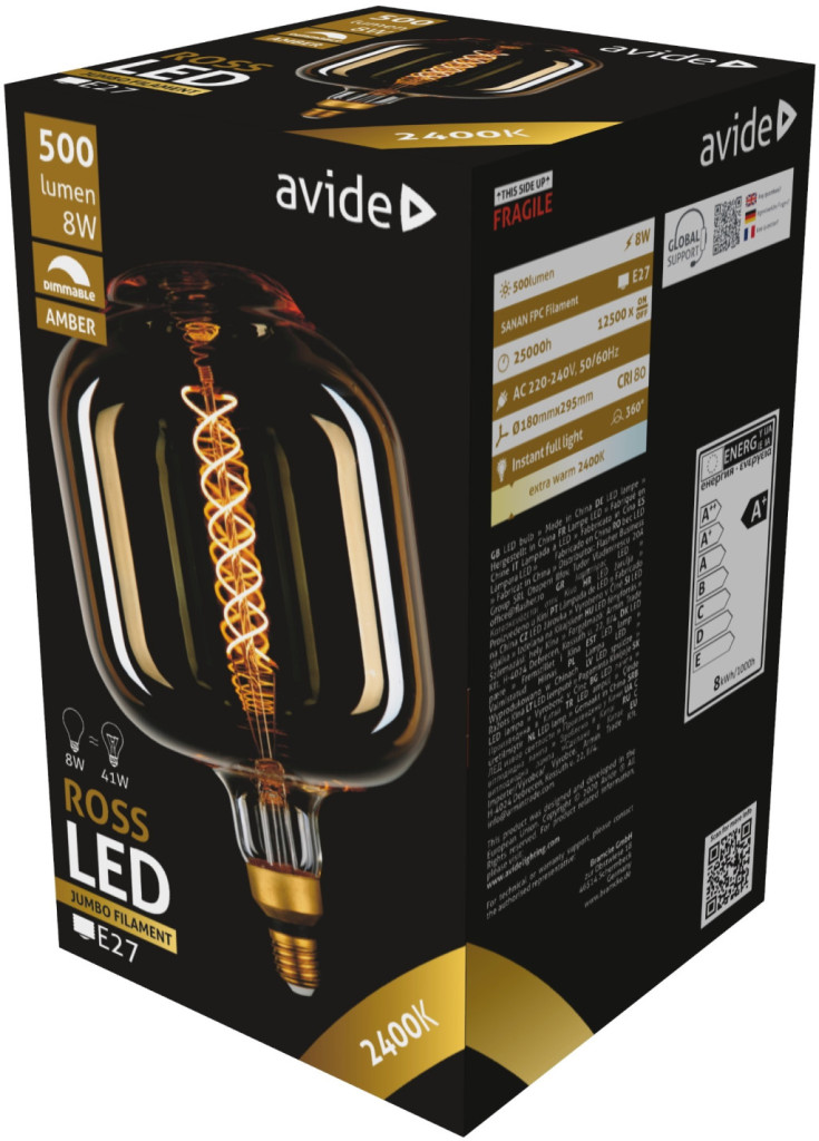 Avide LED Jumbo Filament Ross 180x295mm Amber 8W E27 2400K Fényerőszabályzós