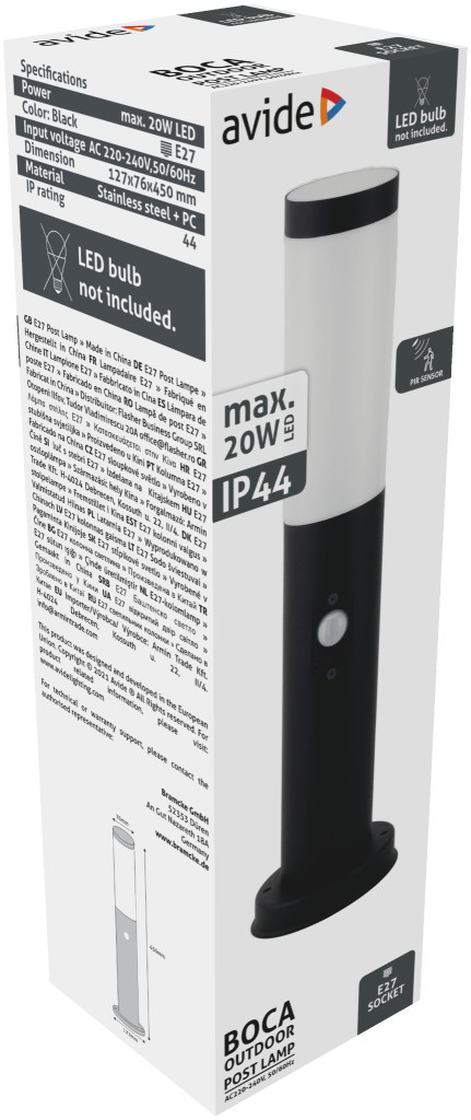 Avide kültéri álló lámpa Boca 1xE27 PIR 450mm IP44 Fekete